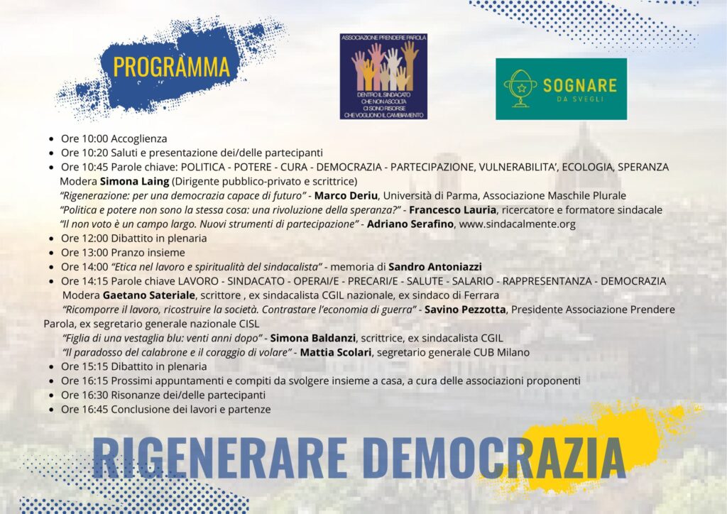 Un invito a tutti/e per informarsi, per partecipare al seminario del 31 gennaio a Firenze (presso Fiesole) per “Rigenerare democrazia”. Un incontro fra storie e traiettorie politiche e personali diverse, per una ripartenza possibile per chiunque sia interessato a condividere questo percorso. Una riflessione sul senso del pluralismo dei e nei corpi intermedi come principio di vitalità democratica. Quella vitalità che manca all’azione sindacale perché è venuta scemando nella vita interna delle organizzazioni dove il senso critico anziché essere valorizzato e incentivato è temuto come una minaccia alla coesione dell’organizzazione.